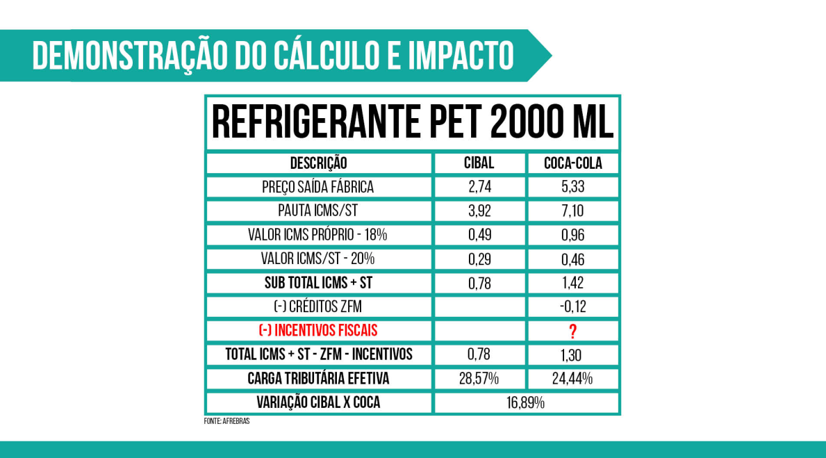 Durante a audiência, Fernando citou a empresa Refrigerantes Cibal, de Passa Quatro, a cerca de 440 quilômetros de Belo Horizonte, que tem de arcar com uma carga tributária efetiva de 28,57% em relação ao ICMS. Entretanto, a multinacional Coca-Cola paga apenas 24,44%, por causa da redução de impostos obtida por meio de incentivos fiscais concedidos pelo governo do Estado e da Zona Franca de Manaus.