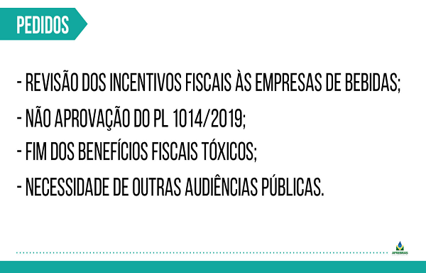 Durante a audiência, o presidente da Afrebras também afirmou que a carga tributária efetiva das grandes corporações do setor de refrigerantes está abaixo da prevista no regime tributário Simples Nacional. Ele ressaltou que o Estado não cumpre o papel de neutralidade, porque não responde de maneira correta, quando é questionado sobre incentivos fiscais.